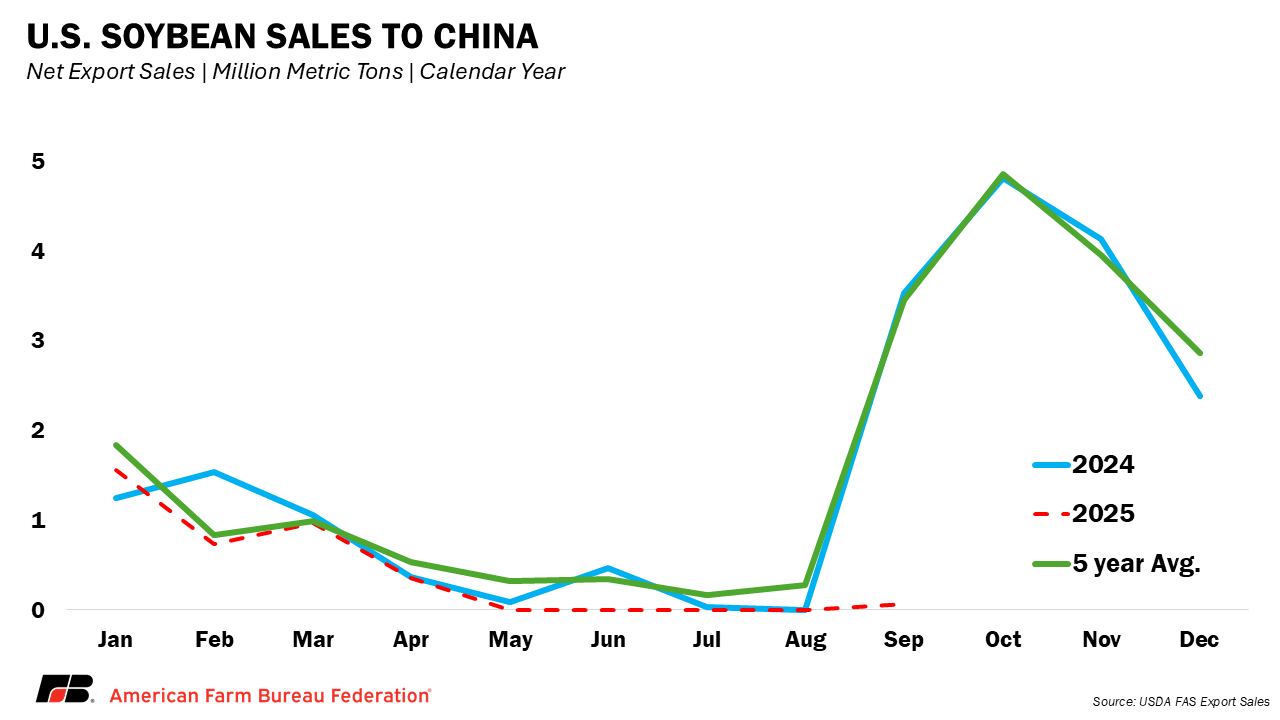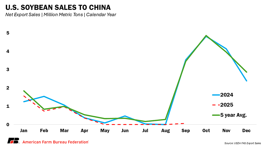 Soybean markets have become the clearest signal of stress in U.S. agricultural trade. From January through August 2025, U.S. soybean exports to China totaled just 218 million bushels, down sharply from 985 million bushels in 2024, when China purchased about half of all U.S. soybean exports. During June, July and August, the U.S. shipped virtually no soybeans to China and China has not purchased any new-crop soybeans for the upcoming marketing year.