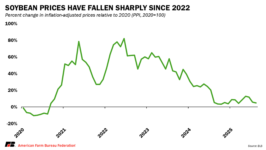 This shift is not limited to soybeans. China has not purchased any U.S. corn, wheat or sorghum this year, and pork and cotton exports continue only at reduced levels. USDA projects that U.S. agricultural exports to China will total $17 billion in 2025, down 30% from 2024 and more than 50% from 2022. In 2026, exports to China are expected to fall to just $9 billion, the lowest level since the 2018 trade war.