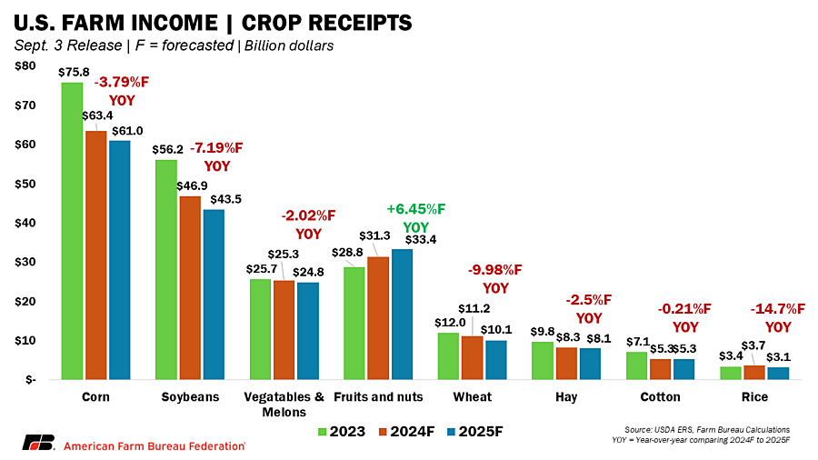 Farmers are facing an extraordinary challenge of declining export opportunities, falling crop prices and rising costs. Without reliable access to key markets, U.S. farm products risk piling up at home, putting downward pressure on prices and tightening margins. USDA’s latest forecast underscores that challenge: cash receipts from crop sales are projected to fall 2.5% from $242.7 billion in 2024 to $236.6 billion in 2025, the lowest level since 2007. The reduction reflects both lower prices and reduced sales volume. For many farmers, weaker demand abroad is compounding financial strain at home, turning strong harvests into tighter margins.
