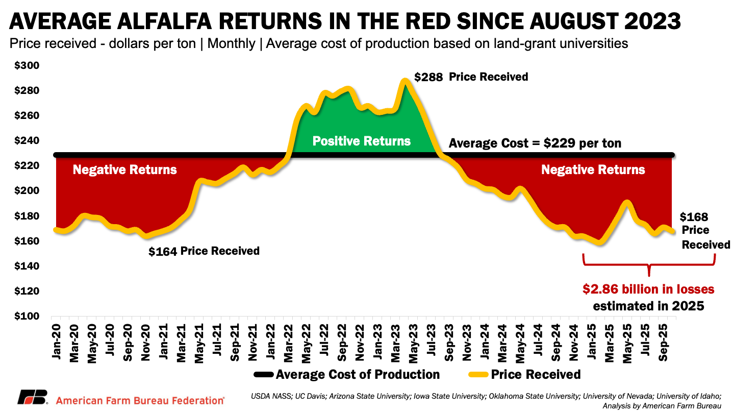 Those pressures are now reflected clearly in returns. Prices spiked during the drought-driven supply tightening of 2021–2022, but that rally reversed as weather conditions improved and export demand weakened. With prices now below full economic cost in many regions, losses have widened — and alfalfa is not eligible to receive to payments from the recently announced $11 billion Farmer Bridge Assistance Program, leaving the sector’s current shortfall unaddressed.