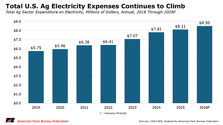 Total electricity demand is expected to increase over the coming years, requiring significant investment in transmission, substations and generation capacity. These costs are often recovered through higher electricity rates, though utilities are increasingly using tools such as large load tariffs to help manage infrastructure expansion and limit impacts on other customers. Ensuring grid investments expand capacity without shifting disproportionate costs onto farm operations will be important for maintaining the competitiveness of U.S. agriculture.