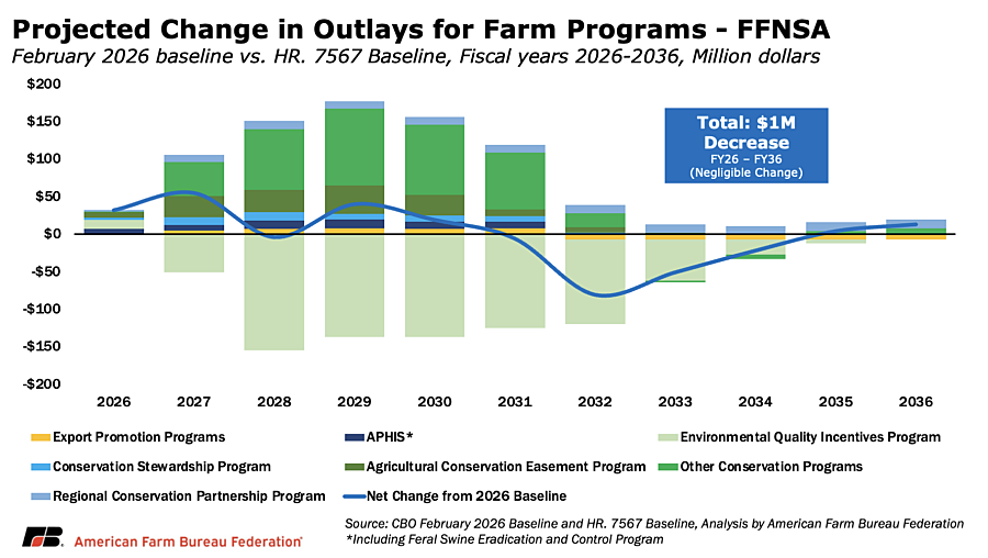 Comparing CBO’s February 2026 baseline to projected outlays under FFNSA shows conservation programs account for most of the scored adjustments over the 2026–2036 window. While EQIP outlays are lower relative to baseline in certain years, those shifts are largely offset by increases in CSP, ACEP and other conservation authorities, resulting in a net decrease of just $1 million over the decade — effectively flat relative to baseline.