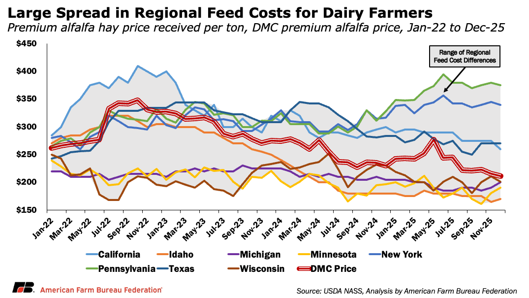 On the feed side, variation can be just as pronounced. Using premium alfalfa hay as an example, the national DMC feed formula averaged roughly $237 per ton in 2025. But that benchmark masked substantial regional differences. In Pennsylvania, average alfalfa prices were approximately $370 per ton, or 56%, higher than the DMC reference price. New York producers paid roughly $341 per ton, or 44%, above the benchmark. In contrast, states with larger alfalfa production, such as Minnesota and Wisconsin, saw prices come in 21% and 15% below the DMC benchmark, respectively.