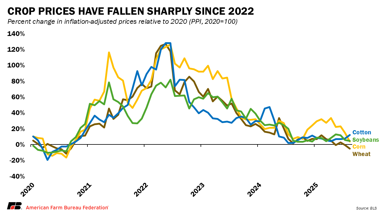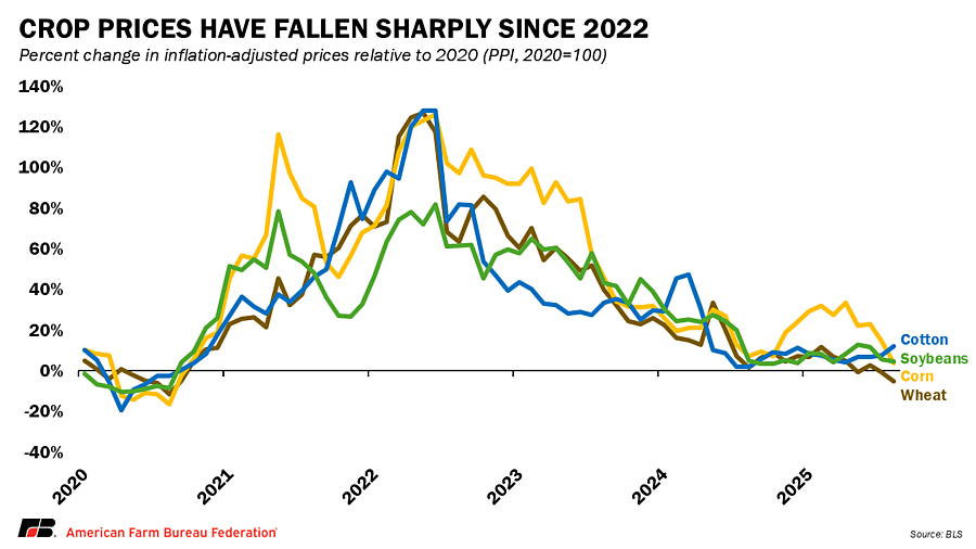 Row crop farmers are stuck in a cost-price squeeze that threatens profitability even in years of good harvests. Prices for corn, soybeans, wheat and cotton have all fallen from recent highs, while costs for seed, chemicals, energy, equipment, fertilizer, land, interest and labor remain stubbornly high. Many specialty crop growers also face similar headwinds, though limited public data make it harder to reveal per-acre profitability as easily.