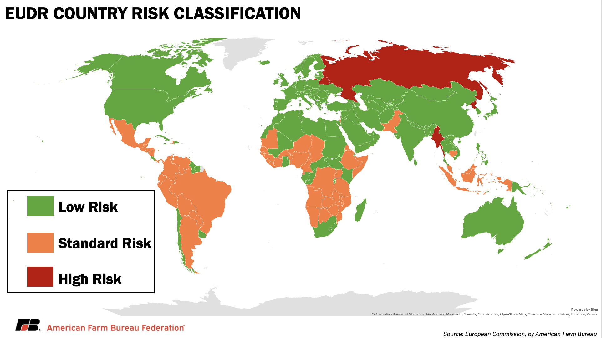 The core of EUDR revolves around being able to prove that each plot of land used to produce EU imports was not recently in forestland. The United States is classified as “low-risk,” and therefore unlikely to import products linked to deforestation. This cuts down on the number of inspections U.S. businesses are subject to, but it does not erase the extensive data and traceability requirements required to ensure compliance. Interestingly, despite being recognized as a major deforester, Brazil is only categorized as a standard risk and also have less stringent compliance checks, largely due to government tracking of the issue rather than actual prevention of deforestation.