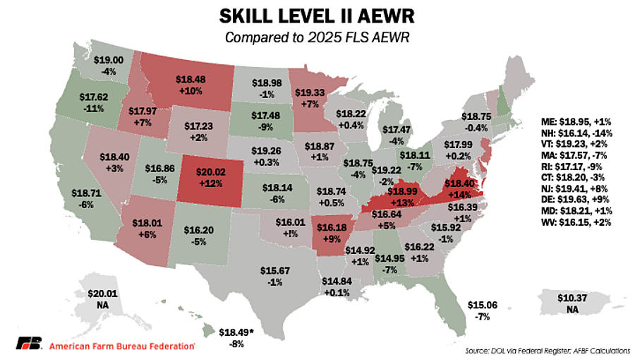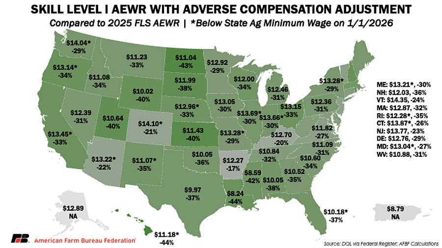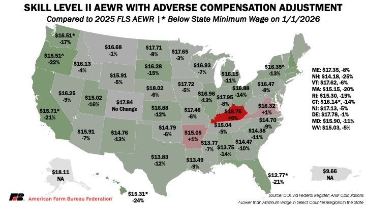 The adverse compensation adjustment would push the AEWR below the state minimum wage for eight states: Arizona, Colorado, Illinois, Indiana, Maine, Maryland, Nebraska and New Mexico. This puts domestic and H-2A workers back at the same wage, despite the compensation disparities DOL says exists between the groups. Even at the higher Skill Level II wages, seven states have AEWRs below the state minimum wage with the compensation adjustment (California, Connecticut, Florida, Hawaii, New York, Oregon and Washington), eradicating the efforts to allow higher compensation for higher skilled employees and level the payroll costs, and living expenses, of H-2A and domestic workers.
