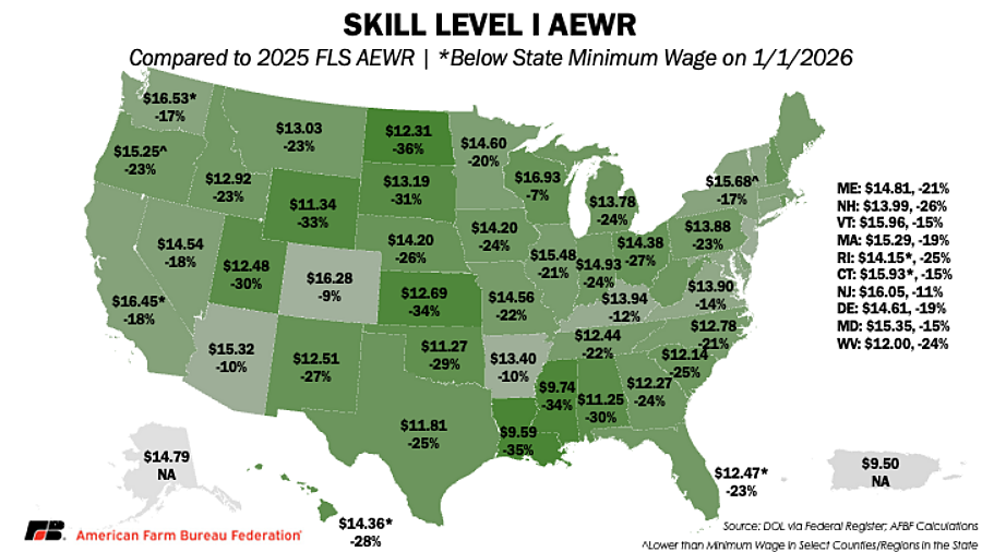 This adjustment results in nearly immediate savings for every state as any job orders certified after the introduction of this rule will be certified with the new wage rates. However, because H-2A employers must pay the highest of the AEWR, the state or federal minimum wage, the prevailing wage or the collective bargaining wage, many states will now face state minimum wages above the AEWR. This will limit cost savings to farmers in those states.
