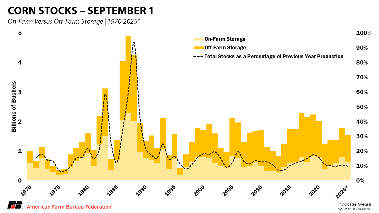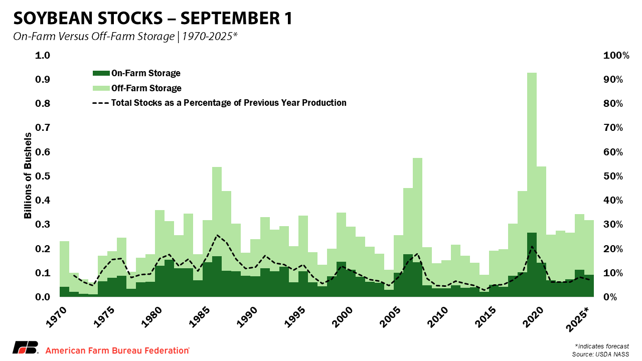 While corn and soybean inventories have eased compared to last year, they remain historically large. As of Sept. 1, corn stocks totaled 1.52 billion bushels, down 13% from 2024. Corn stored on farms was 640 million bushels, down 18% from a year ago, while off-farm stocks totaled 880 million bushels, down 10%.