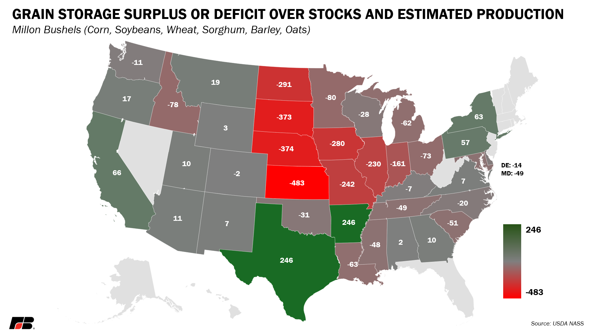 When transportation slows, storage becomes the pressure valve that keeps the system from seizing up. U.S. storage capacity is estimated at 25.48 billion bushels, which leaves roughly 2.4 billion bushels less space than needed to hold total production and existing stocks. This shortfall is based on combined corn, soybean, wheat, sorghum, barley and oat production along with beginning stocks reported in USDA’s September WASDE.