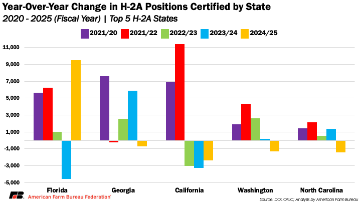 Nearly 50% of the certifications in FY 2025 work in the top five user states: Florida, Georgia, California, Washington and North Carolina. Florida far outpaces all other states, accounting for over 14% of FY 2025 certifications and adding over 9,000 additional workers from 2024, despite a 10% increase in their Adverse Effect Wage Rate (AEWR) during the fiscal year. Interestingly, the other four leader states all decreased in certifications, with California certifying over 2,000 fewer workers in 2025 than in 2024, their third straight year of decline in H-2A use.