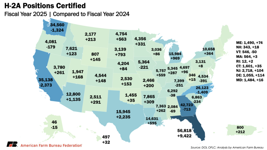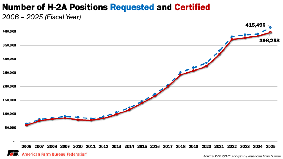 The H-2A program continues to grow, with 13,358 more positions certified in fiscal year 2025 (October 2024-September 2025) than fiscal year 2024. This marks the first year in program history that over 400,000 workers were requested, highlighting the continued domestic labor shortages American farmers and ranchers face.