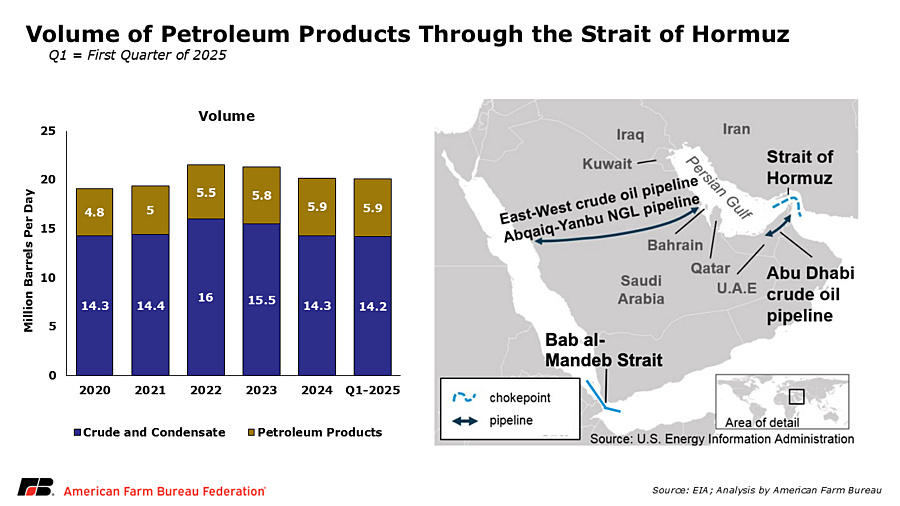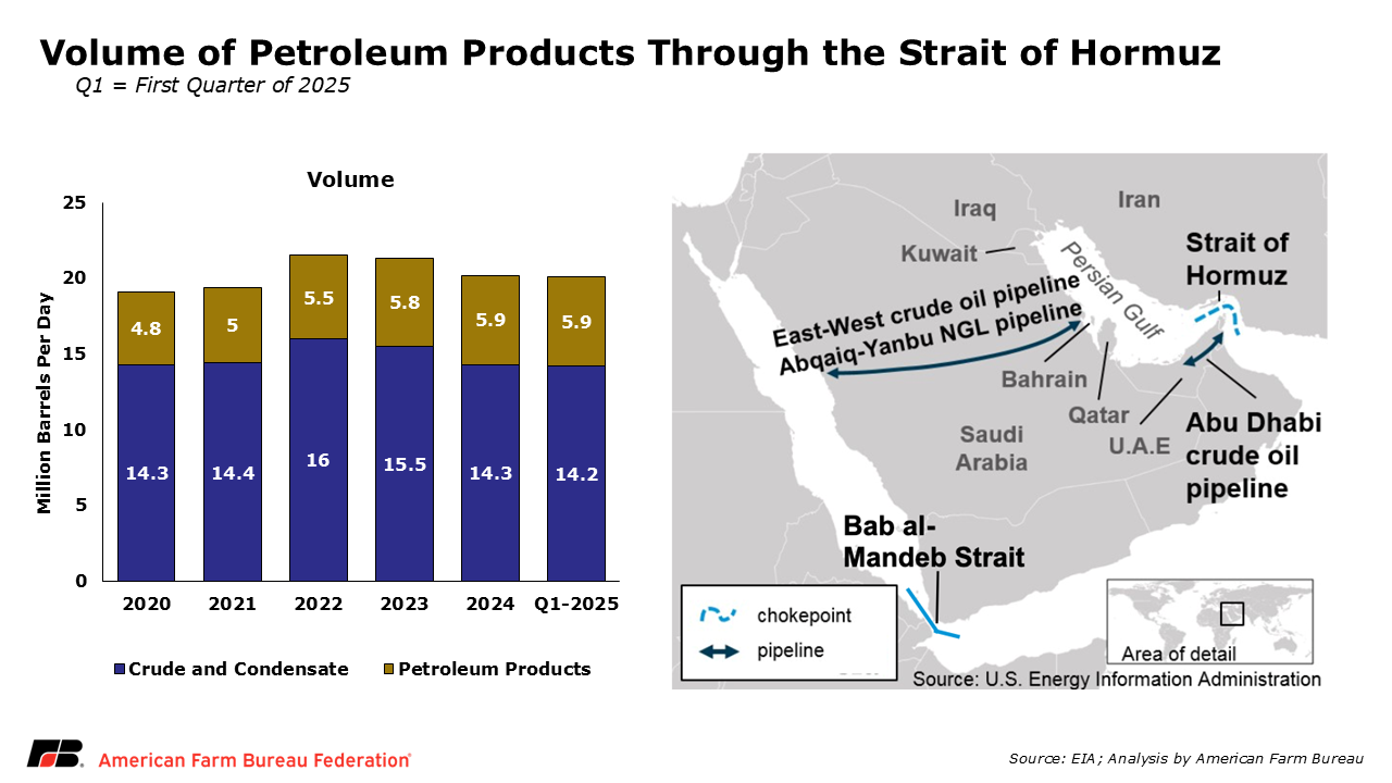 The Strait of Hormuz is central to energy and fertilizer trade. Oil flowing through the Strait averaged about 20 million barrels per day in 2024, roughly 20% of global petroleum liquids consumption. Because energy is a major input to fertilizer production and transportation, disruptions or heightened risk in the region can amplify volatility across agricultural input markets.