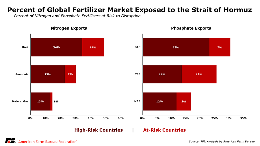 This means that even though the United States does not directly import large quantities of fertilizer from the Middle East, domestic fertilizer markets still respond to price movements in the region. For instance, if countries that rely more heavily on Persian Gulf fertilizer supplies, such as India or Brazil, are forced to seek alternative sources, their demand may shift toward other global suppliers, increasing competition for available product and driving prices higher for U.S. farmers. Global fertilizer supply conditions can also be affected by policy actions in other major producing countries. For example, China has periodically considered or implemented fertilizer export restrictions to prioritize domestic supply, which can tighten global availability, particularly for phosphate fertilizers. They currently are restricting exports until the end of August 2026.