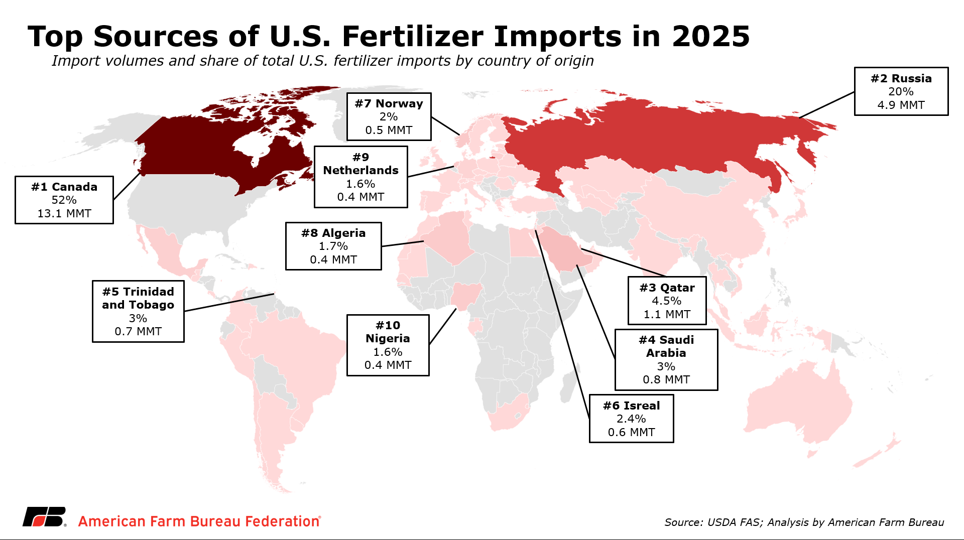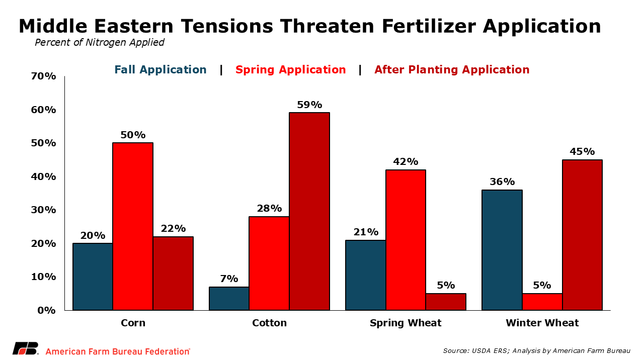 In total, about 50% of nitrogen applied to corn, 28% applied to cotton and 42% applied to spring wheat is typically applied in the spring. As a result, disruptions to fertilizer supply chains during this early period could have outsized effects on input availability and prices, potentially affecting crop yields and farm operational schedules during the most critical months of the planting season.