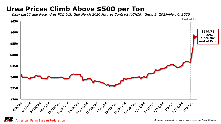 American farmers are entering the 2026 spring planting season amid geopolitical tensions involving Iran and nearby Persian Gulf countries, which adds uncertainty to global energy and fertilizer markets. This timing matters because fertilizer purchasing, field preparation and early season fertilizer applications are already underway, limiting farmers’ ability to adjust if input prices spike suddenly. Anecdotally, farmers are already considering reducing corn acres planted in exchange for crops like soybeans that are less exposed to fertilizer price volatility.