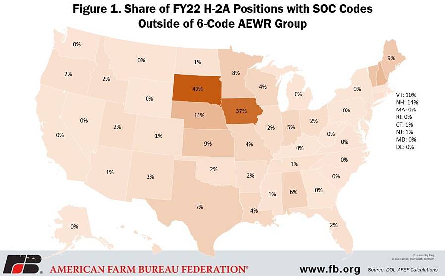 However, as is usually the case, the average occurrence of H-2A positions that fall outside the six SOC code AEWR group varies significantly from state to state. The fiscal year 2022 disclosure data reveals that there are some states like Alaska, Delaware, Massachusetts, Rhode Island, West Virginia and Wyoming that didn’t have a single certified H-2A position that fell outside of the six SOC code AEWR group. For another 13 states (Kentucky, Pennsylvania, Georgia, Nevada, Washington, North Carolina, South Carolina, Michigan, Montana, New York, Maryland, California and Virginia) there were a handful of positions that were classified with SOC codes outside of the six SOC code AEWR group, but the number of those positions relative to the total number of certified positions rounded down to 0%. For another 20 states, the share of SOC codes outside of the six SOC code AEWR group rounded to 1-4% of the total number of certified positions. But, as shown in Figure 1, for 12 states, the share of SOC codes outside of the six SOC code AEWR group accounted for 5% or more of total H-2A positions. The two states that stand out the most here are Iowa and South Dakota, where the share of SOC codes outside of the six SOC code AEWR group accounted for 37% and 42% of total H-2A positions, respectively.