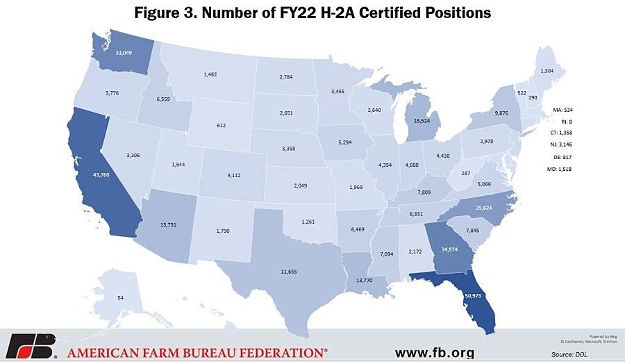Finally, this author has on many occasions complained that the Office of Foreign Labor Certification has not published an annual report since fiscal year 2016. This was the primary tool to learn more about H-2A usage in all 50 states. However, I recently discovered the following notice on the OFLC website: “[I]n order to promote more efficient use of limited resources, [OFLC] is discontinuing the publication of our Annual Report. OFLC will continue to publish and publicly release program data on our website through our quarterly-released Selected Statistics and Disclosure Data reports.” While the annual reports were more user-friendly, it is welcome that the disclosure data reports allow us to know more about H-2A usage across the U.S. We will go into more detail about the number of certified positions in each state over the years in subsequent Market Intel articles, but a summary of the fiscal year 2022 disclosure data reveals that, indeed, the H-2A program is utilized in every state, as depicted in Figure 3.