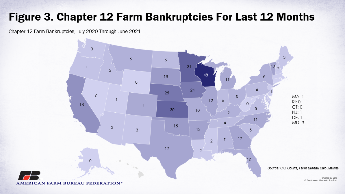 Total bankruptcies filed by state vary significantly, from no bankruptcies in some states to as many as 48 filings in others, as shown in Figure 2. Alaska, Connecticut, Hawaii, Nevada, Rhode Island, West Virginia and Wyoming had no Chapter 12 bankruptcies filed in the past year. These states have consistently had low numbers of bankruptcies in the past decade. In contrast, Wisconsin, Minnesota and Kansas led the nation in Chapter 12 filings; though there were fewer filings in each of these states than there were in the previous year.
