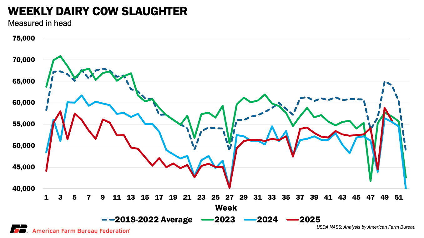 That pattern is evident in slaughter data. After months of comparatively low dairy cow culling, slaughter volumes in the final weeks of 2025 moved closer to recent norms. Even so, cumulative dairy cow slaughter through the first 50 weeks of 2025 totaled 2.53 million head, the lowest level in more than a decade, down from 2.61 million in 2024 and well below the roughly 3 million head slaughtered annually in most prior years. In short, fewer milk cows have been exiting the herd.