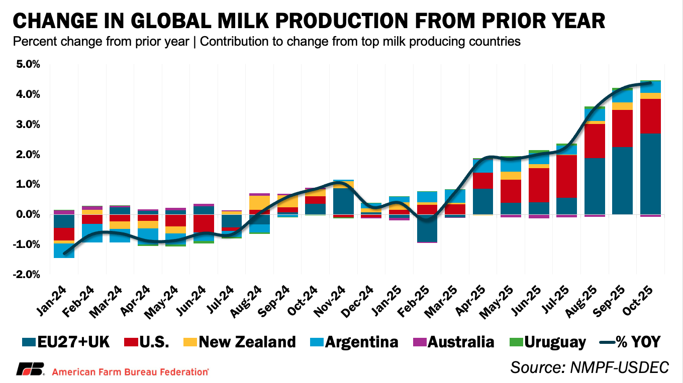 Layered on top of elevated U.S. cow inventories, global milk production has also been accelerating, reinforcing near-term supply pressure across dairy markets. The U.S. is on pace to post record milk production in 2025, with 876 million metric tons produced from January through October, up from 855 million metric tons in 2024 and 859 million metric tons in 2023 — an increase of roughly 2.4% year-over-year. That growth has not occurred in isolation. Other major exporting regions have also expanded output over the same period, adding to global availability. Milk production from the EU-27 plus the United Kingdom, New Zealand, Argentina and Uruguay rose by approximately 1.5%, 2.0%, 9.7% and 6.8%, respectively, compared to the first 10 months of last year. Australia was the lone major producer to post a decline, with output down roughly 6.8% year over year. Across key producing regions, combined milk production increased by roughly 54 million metric tons total, or 2.1%, from January through October 2024, with growth heavily concentrated in the U.S. and the EU27 plus the U.K., which together accounted for the majority of the volume gains.