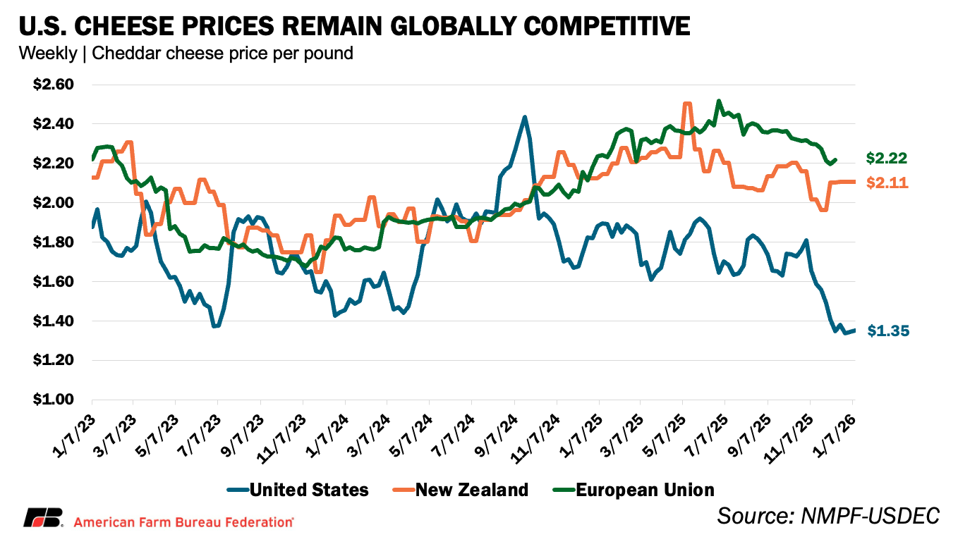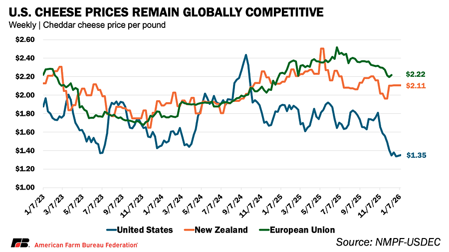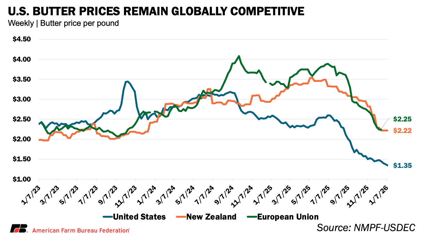 While these price declines have strained the milk side of dairy balance sheets, they have strengthened the competitive position of U.S. dairy products abroad. Since October, U.S. cheddar prices have averaged roughly 36% below New Zealand and 42% below the European Union, while U.S. butter prices have been even more discounted — about 73% lower than New Zealand and 68% lower than the EU.