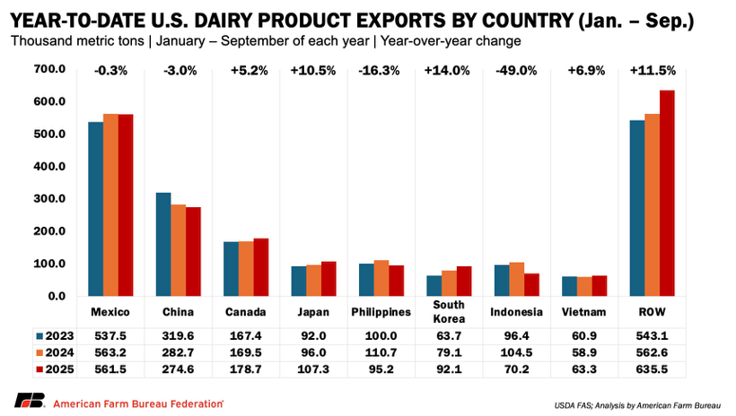 That pricing advantage has supported record U.S. dairy product exports in 2025, with shipments rising from approximately 2.02 million metric tons to 2.07 million metric tons between January and September, an increase of roughly 51,000 metric tons (2.4%) from to the same period in 2024. Even as exports to some major partners, including Mexico and China, softened, gains in Canada, Japan, South Korea, Vietnam and a growing number of smaller destination markets more than offset those declines, underscoring how broad-based price competitiveness is reshaping U.S. export flows.