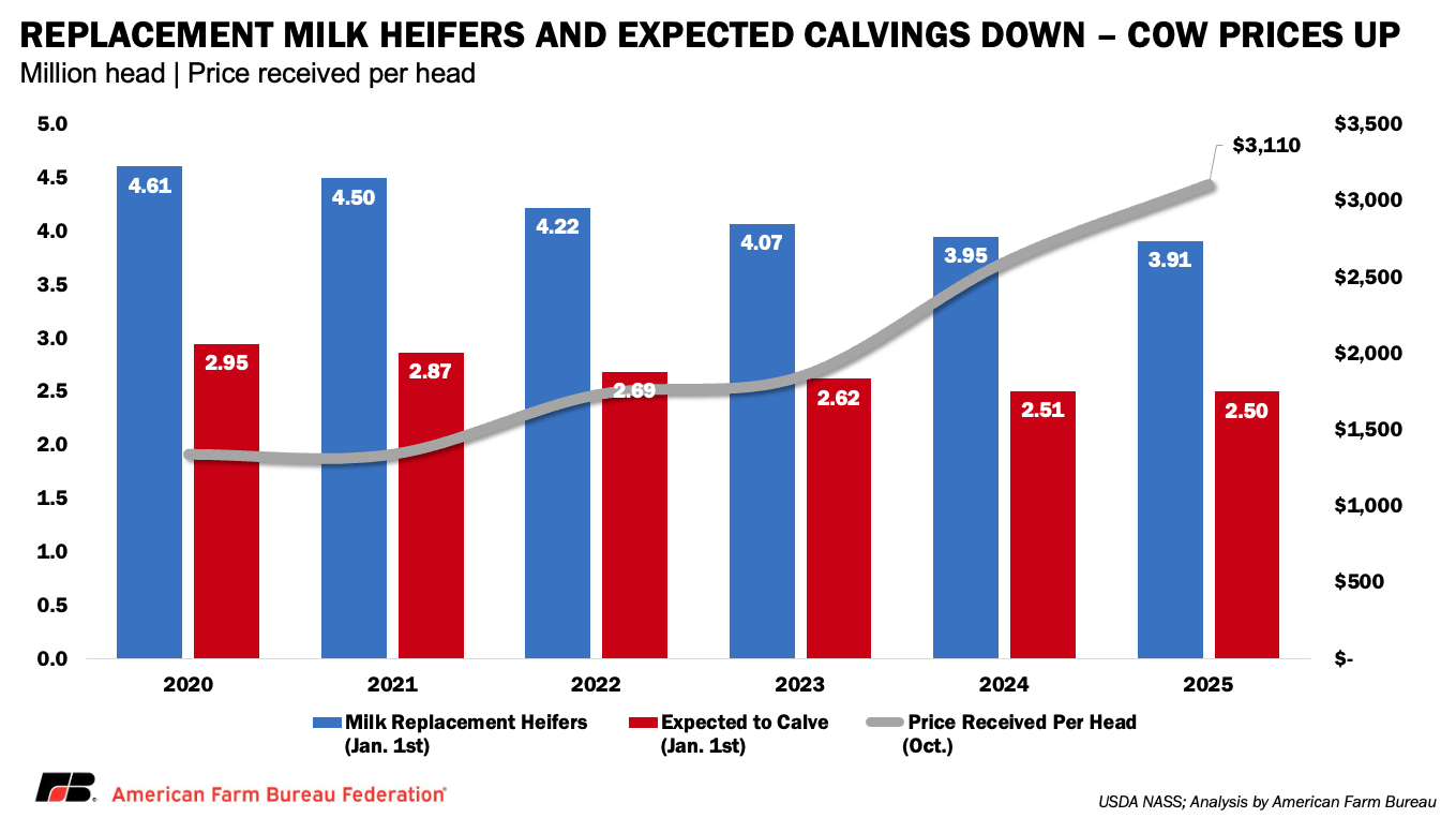 Despite record milk cow inventories, the pipeline supporting those numbers is tightening. According to the January Cattle Inventory report, milk replacement heifer inventories fell to 3.91 million head in 2025, the lowest level since 1978 (3.89 million). More concerning for the medium-term outlook, the number of dairy replacement heifers expected to calve in the future declined to roughly 2.5 million head, the lowest level since USDA began reporting the series in 2019 and well below the nearly 3 million head recorded just a few years ago.