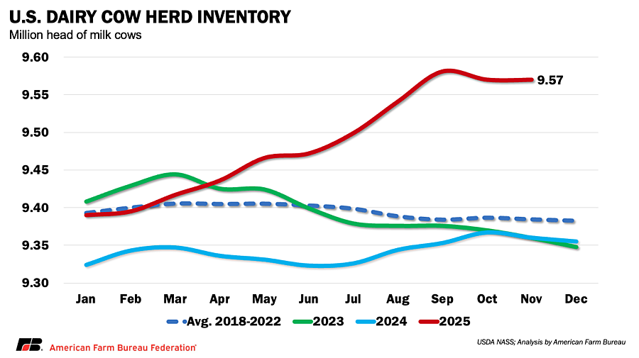 As of November 2025, the U.S. milk cow herd totaled 9.57 million head, the most since 1993, when inventories peaked at 9.58 million head. While cow numbers remain well above recent years, growth has begun to slow, suggesting the current expansion may be losing momentum.