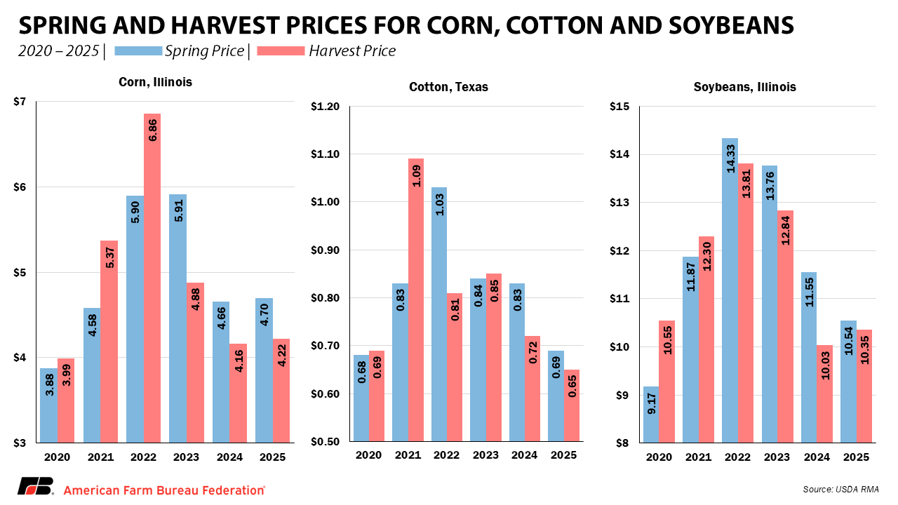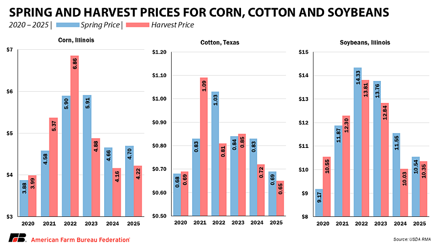 For 2025, spring prices were $4.70 per bushel for corn, 69 cents per pound for cotton and $10.54 per bushel for soybeans. Harvest prices settled lower, at $4.22 for corn (down 10.2%), 65 cents for cotton (down 5.8%) and $10.35 for soybeans (down 1.8%).