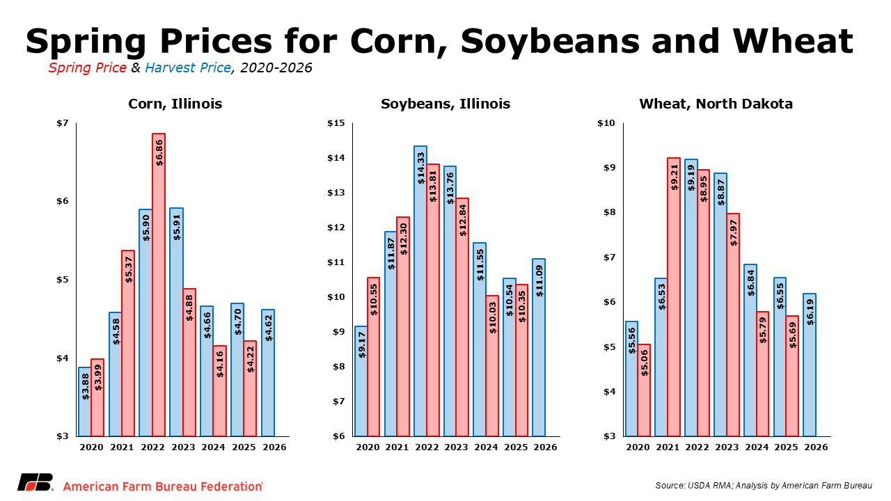 Against this backdrop, crop insurance spring prices and farm program benchmarks provide important reference points for evaluating potential revenue outcomes and downside risk in the 2026 crop year. These benchmarks help define the level of protection available through the farm safety net and provide context for producer risk management decisions.