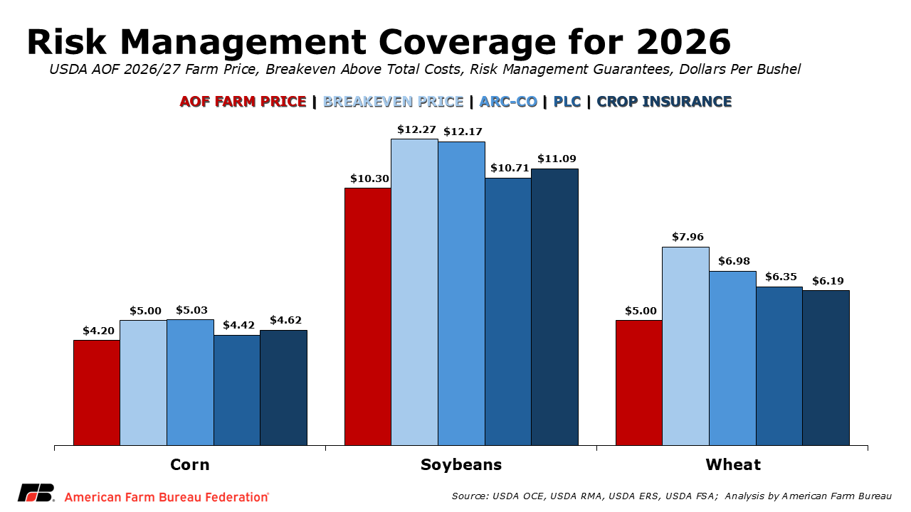 USDA’s Agricultural Outlook Forum (AOF) projects 2026 marketing year average prices of $4.20 per bushel for corn, $10.30 per bushel for soybeans and $5 per bushel for wheat. In comparison, estimated national average break-even prices, the price needed to cover total production costs, i.e., variable and fixed production expenses, are approximately $5 per bushel for corn, $12.27 per bushel for soybeans and $7.96 per bushel for wheat.