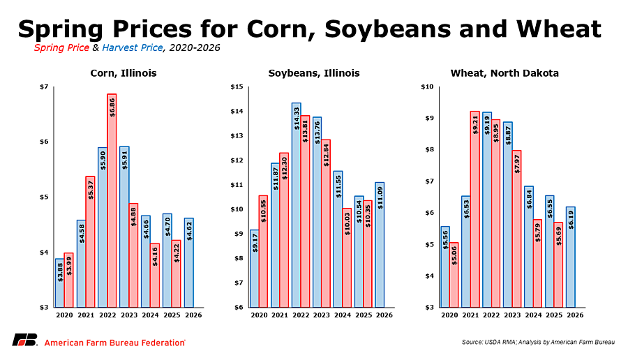 Following the February price discovery period, USDA’s Risk Management Agency (RMA) has finalized spring crop insurance prices for the 2026 crop year, establishing the revenue guarantees farmers will use to manage risk. Projected prices reflect current market supply and demand expectations and provide an important opportunity to protect against further price or revenue declines. Risk management and marketing strategies are critically important when input costs are high.