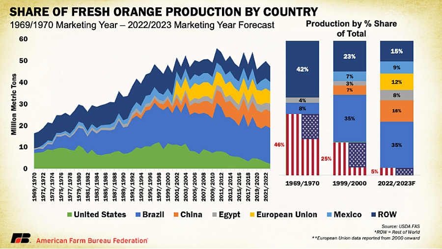 Citrus growers have endured one of the steepest cost escalations in specialty agriculture. The cost of farming navel oranges in California rose from $1,555 per acre in 2005 to $4,215 by 2025, while regional regulatory compliance costs alone jumped from $67 to $447 per acre between 2012 and 2018. Even after Canadian tariffs on U.S. citrus were lifted in early 2025, years of rising imports, persistent disease pressures and stagnant prices have left growers with razor-thin returns. Declines in U.S. production, especially Florida, from these pressures have diminished the country’s longtime role as a leader in global market share. In 1970, for instance, the U.S. produced nearly half of the world’s oranges. This number dropped to 25% by 2000 and is expected to be just 5% for 2023.