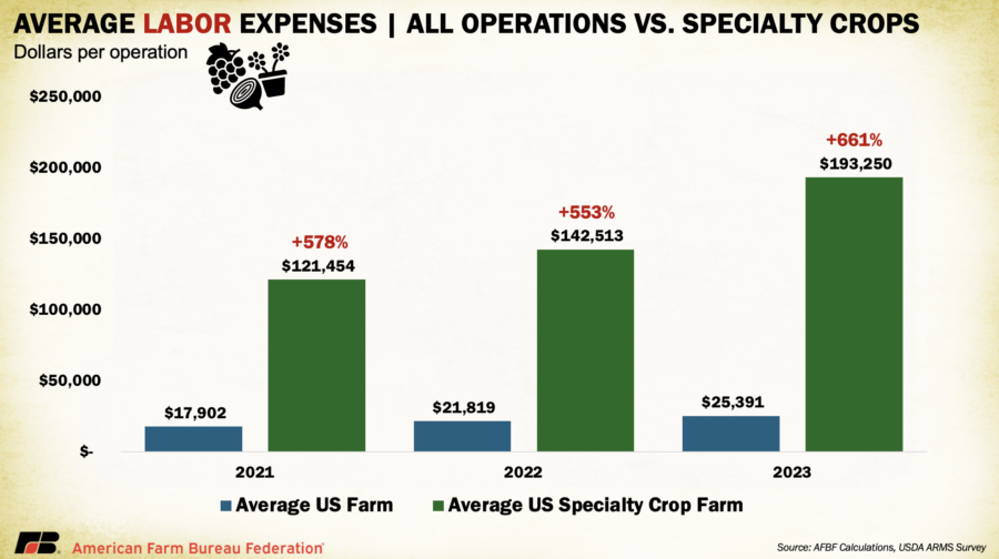 According to USDA’s Agricultural Resource Management Surveys, specialty crop farms averaged more than $466,000 per farm in cash expenses in 2023, up 47% from 2021 and 160% higher than the average farm operation. Labor alone, which accounts for nearly 40% of total production costs, averaged $193,250 per farm, up 60% from 2021 and over six times higher than the national average. With input inflation persisting and disruptions to labor conditions in 2025, these structural costs continue to weigh heavily on profitability across the sector.