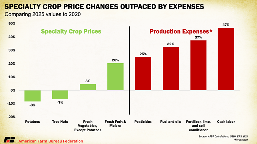 Even in sectors where prices have climbed, those gains have been far outpaced by production expenses, leaving limited opportunities to break even. Between 2020 and 2025, producer price indices show that selling prices for potatoes and tree nuts declined by 8% and 7%, respectively, while fresh vegetables (excluding potatoes) rose just 5% and fresh fruit and melons increased about 20%. Over the same period, growers paid 25% more for pesticides, 31% more for fuel, 37% more for fertilizer and nearly 50% more for labor. These trends mirror the broader input cost pressures facing row crop producers, who are enduring another year of sustained losses.