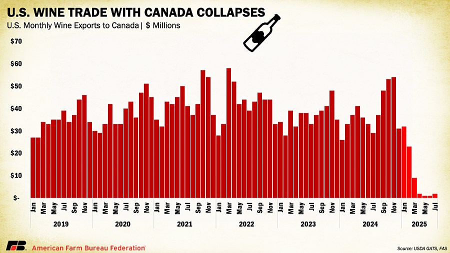 In the wine industry, weak demand continues to weigh heavily on grape prices. U.S. exports to Canada (a key market) have collapsed. Since 2019, Canada regularly imported $20 million to $60 million in U.S. wine each month; so far this year, those shipments have fallen to nearly zero. Silicon Valley Bank’s State of the U.S. Wine Industry 2025 projects that up to 50,000 acres of vineyards may need to be removed to restore market balance.