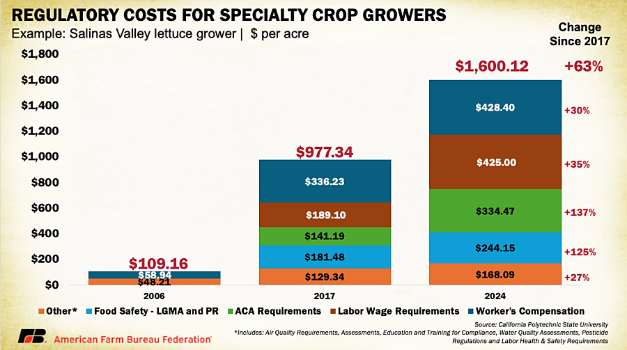 Vegetable growers have not been spared from the mounting cost pressures facing specialty crop producers. Romaine lettuce prices have dropped to $14.55 per carton in 2025, almost half of 2024 levels, while per-acre production costs hover around $17,000,about $17 to $20 per carton at typical yields of 850 to 1,000 cartons per acre. Compliance costs tied to food safety, labor and water quality rules have surged fifteen fold since 2006, rising from $109 per acre to over $1,600 per acre on Salinas Valley lettuce operations. According to Cal Poly’s long-term case study, these expenses (driven by evolving food-safety mandates, groundwater monitoring and new labor laws) now make up over 12% of total production costs, compared to barely 1% two decades ago. Similar pressures extend across the country. In Florida, tomato producers face production costs near $37,000 per hectare (roughly $15,000 per acre), with labor contributing 30%–40% of total expenses and growers often receiving only about one-third of the retail price.