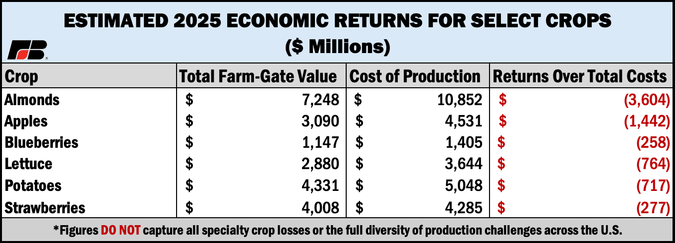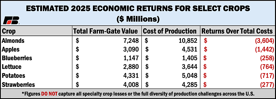 To illustrate the scale of need, this analysis examines six representative crops: almonds, apples, blueberries, lettuce, potatoes and strawberries. These crops were selected because they are among the few specialty commodities with enough available data to conduct analysis, while collectively reflecting the diversity of production systems, regions and marketing channels that define the broader sector. Together, they account for roughly one-quarter of total specialty crop receipts, meaning the true sector-wide losses are significantly larger than what these case studies alone capture. Yet the pressures outlined here (high labor and input costs, tightening margins, weather and disease challenges and ongoing trade instability) are shared across nearly the entire specialty crop sector.