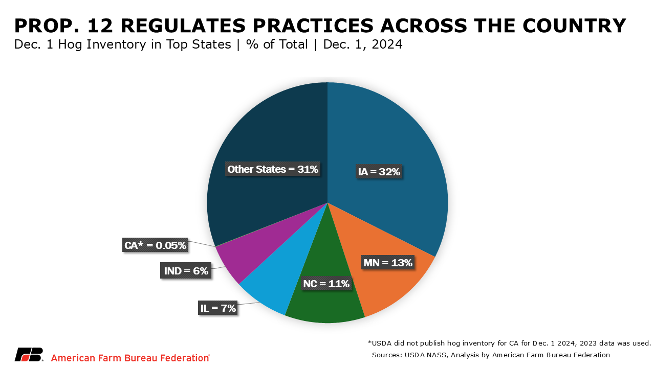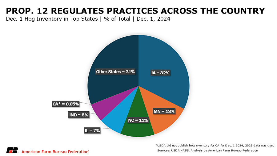 Proposition 12 took effect on Jan. 1, 2024. According to data from USDA’s National Agricultural Statistics Service, California is home to less than 1% of the U.S. hog inventory, which means top-producing states such as Iowa, home to nearly 33% of hogs in the U.S., are subject to regulations and inspections from a state with hardly any domestic hog production of its own. California requires pork from about 8% of North American sows to meet its demand. Most farms that use conventional methods to raise hogs required substantial changes to meet the new standards set forth by Proposition 12. When the law was passed, almost no farms in any state followed the standards set forth by the ballot initiative.