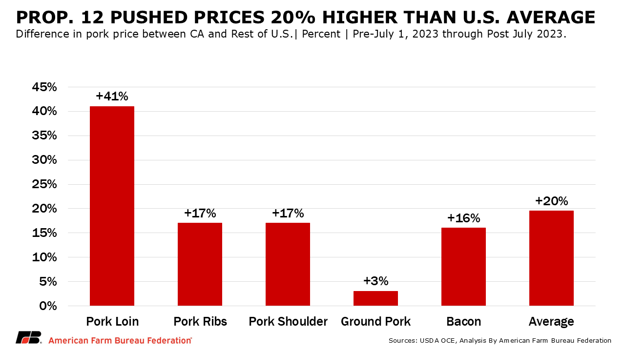 According to a study by the University of California’s Gianni Foundation, prices for Proposition 12-compliant pork products rose by an average of 20% leading up to the full implementation of the law. Pork loins had the greatest increase in price, as high as 41%. When Proposition 12 went into effect, prices went up, making pork, a nutritious and typically affordable protein source, less affordable. Further, the Gianni Foundation study showed the impact of the higher prices on people’s pork purchases, with California’s share of consumption falling from 10% of all U.S. pork to 8% when Proposition 12 took full effect on Jan. 1, 2024.