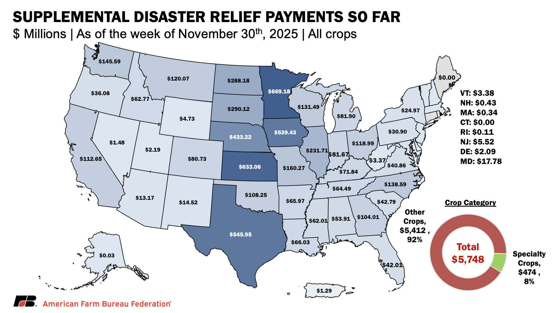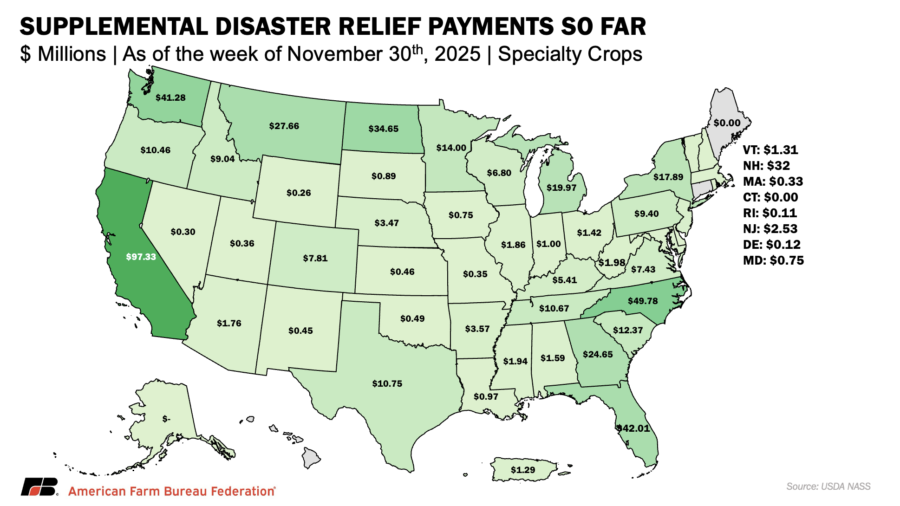 These categories now carry significant weight. As of the week of Nov. 30, USDA has distributed $5.7 billion in SDRP payments through earlier stages. Specialty crops account for $475 million, about 8% of all payments, despite experiencing closer to 20% of total crop-sector natural disaster losses during 2023–2024.